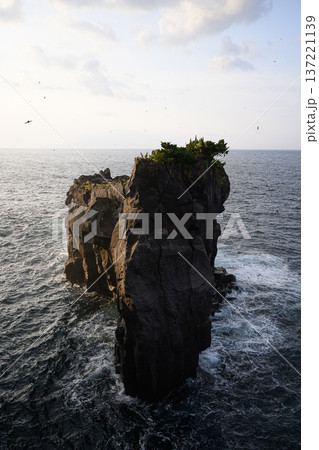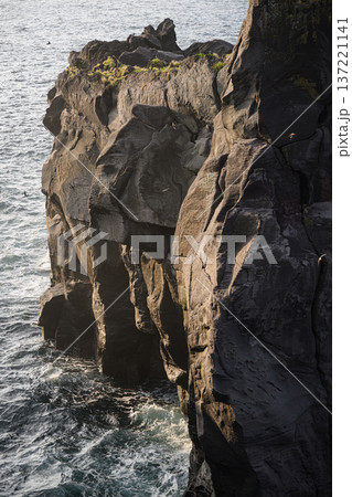 朝日に照らされた断崖と海岸を飛び回るアマツバメ 城ケ崎海岸の風景