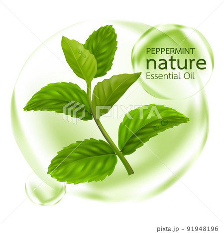 Natural Mint Essential Oil in a Glass Bottle. organic cosmetics with herbal extracts of mint on colored background