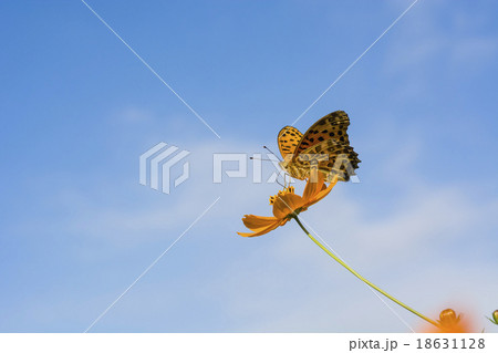 ツマグロヒョウモンのオスとキバナコスモス 青空