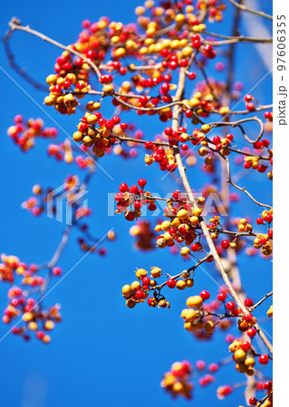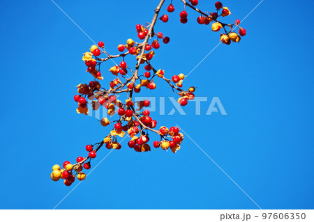 黄色と赤色のツルウメモドキの実(秋、十一月)