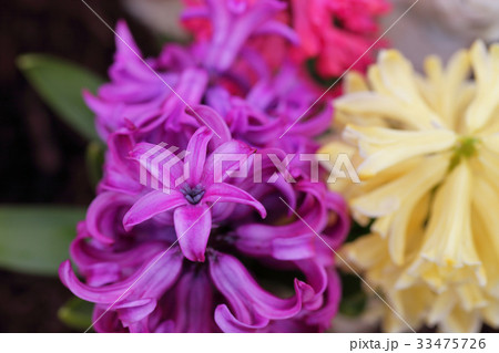 春の庭に咲くヒヤシンスやミニ水仙やパンジーの花