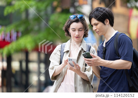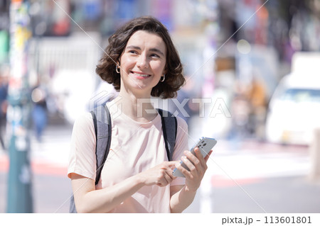 インバウンド スマホを見ながら東京の街を散策する外国人