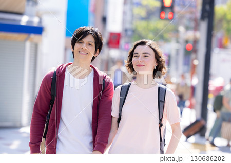 インバウンド 渋谷の街を観光する外国人カップル 縦位置