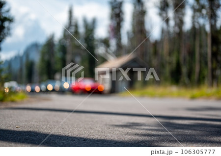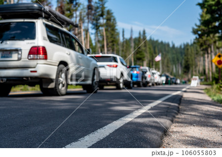 Selective focus on a paved road with a defocused long line of vehicles to enter a national park in the background