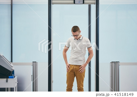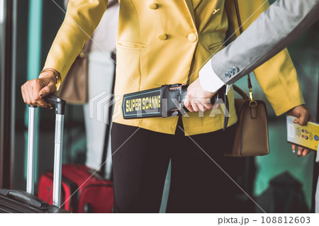 Traveler tourist visitor people security check at the airport gate with handheld metal scanner detector by security guard.
