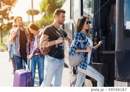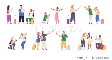Tourists take photos. Tourist friends travel photographer with camera and luggage, family couple travelers selfie in vacation
