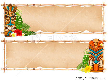 Set of summer banners with Tiki masks and tropical plants vector illustration.
