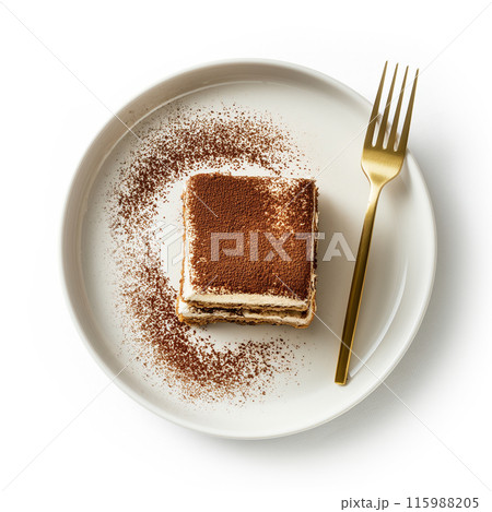 Traditional Italian Tiramisu square dessert portion on ceramic plate isolated on white background with clipping path
