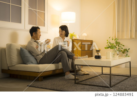 夜のリビングのミドル夫婦