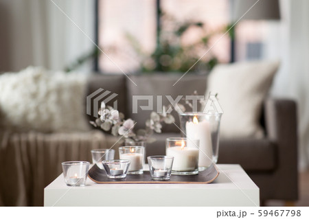 burning fragrance candles on table at cozy home