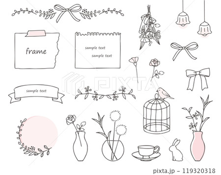 手書きの可愛い植物とリボンの線画イラスト素材セット