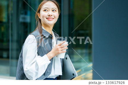 オフィス街でコーヒーを飲む若い女性
