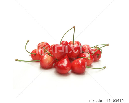 ひとまとまりの艶やかなサクランボ。 白背景 、クローズアップ、フロントビュー。