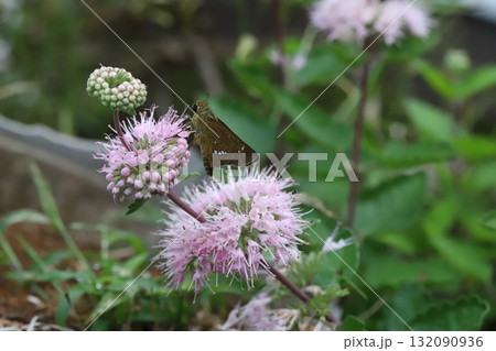 秋の庭に咲くピンク色のダンギクの花の蜜を吸うイチモンジセセリ蝶
