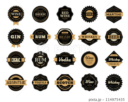 Labels for beer, vodka and whiskey bottles. Vintage wine frame sticker in wood. Alcohol beverage brand logo. Tequila drink. Champagne or bourbon gold badge template. Vector premium stickers design set