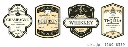 Alcohol label templates. Vector set of vintage alcohol labels for tequila, whiskey, wine, beer, brandy and mojito. Classic emblem layouts for distillery branding, bar themes or beverage packaging