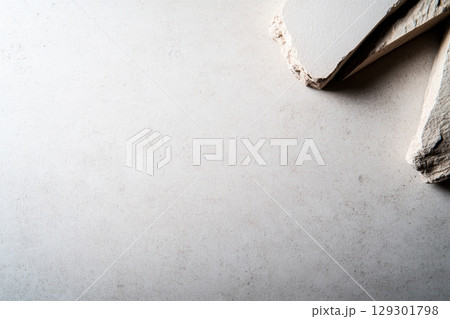 Dry plaster pieces on a smooth surface in a construction workspace