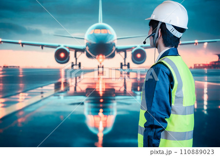 空港の滑走路上で働く若い男性