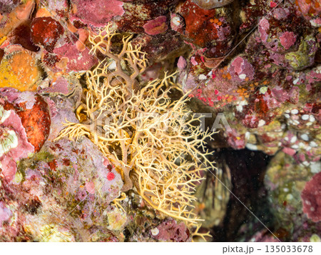 テヅルモヅル(テヅルモヅル科)とオヤビッチャ(スズメダイ科)、キンギョハナダイ(ハナダイ亜科)他群れ