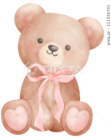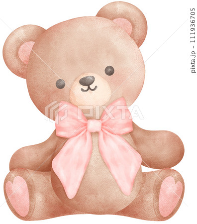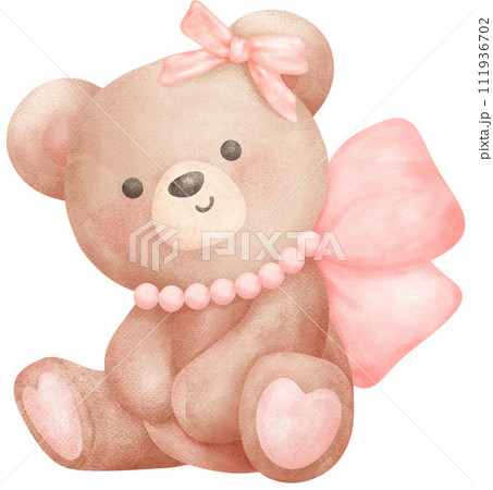 Cute teddy bear with pink bow watercolor illustration