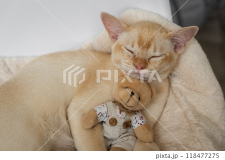 Adorable red Burmese kitten sleeps hugging a teddy bear