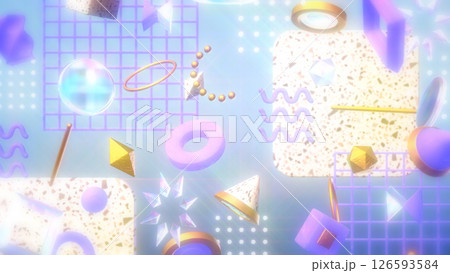 四角いタイトルバックのある幾何学模様やテラゾー柄が並ぶオシャレな3DCG - パープル