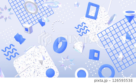四角いタイトルバックのある幾何学模様やテラゾー柄が並ぶオシャレな3DCG - ブルー