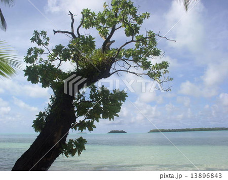 パラオ・カープ島の砂浜と斜めに傾いた樹木