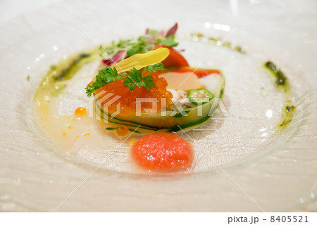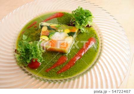 食べ物 春野菜 料理 フレンチ フランス料理 前菜 お惣菜 ゼリー寄せ ゼリー 冷製 野菜料理 透明 コンソメ オクラ しいたけ シイタケ ニンジン ベビーコーン ヤングコーン おもてなし テリーヌ