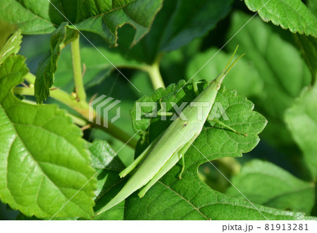 葉の上で休むバッタ バッタの居る風景(緑背景)