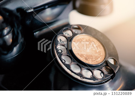 An old antique vintage telephone placed on a wooden table. The classic rotary phone with elegant design and metal details reflects historical charm and retro aesthetics. Perfect image for illustrating