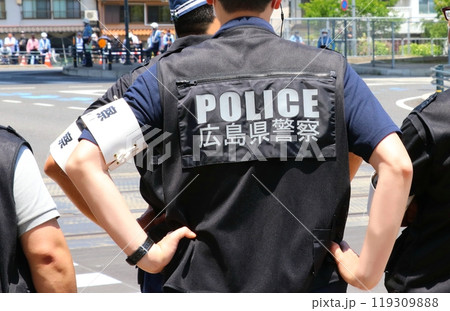 「POLICE広島県警察」の黒ベストを着用した警察官(上半身背中部分、頭部見切れ)