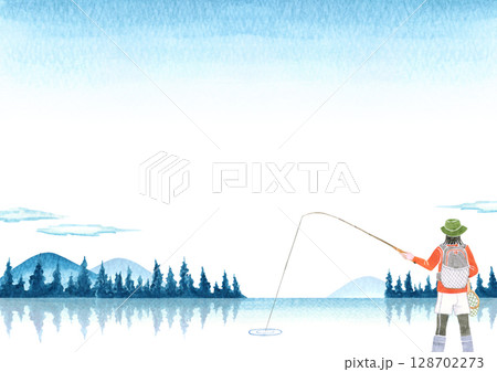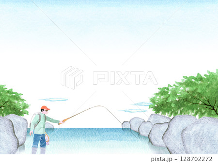 渓流釣り 川釣り 魚釣り 釣り人 背景 水彩 イラスト