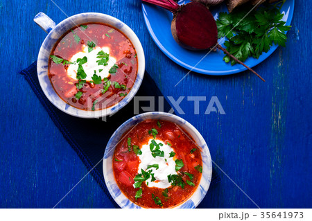 Cold traditional lithuanian vegetable summer soup with kefir and red beet