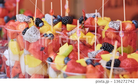 Healthy fresh fruit salad cups with berries and exotic fruit for street food vending