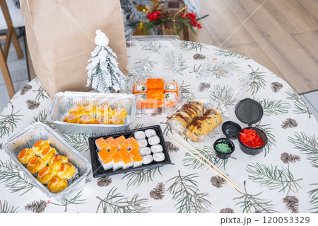 Delivery of sushi and rolls in food containers on the table in the festive interior of the kitchen of the house with a white Christmas tree for Christmas and New year. Food delivery for the holidays