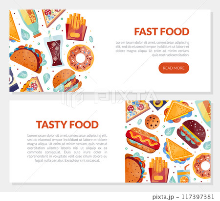 Man Character with Huge Pizza, Hot Dog and Hamburger Eat Fast Food Vector Illustration