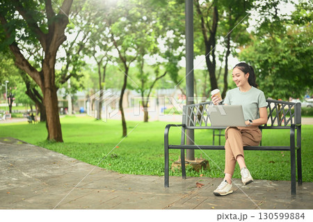 Relaxed female freelancer enjoying remote work outdoors in a green park environment