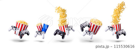 Paper bucket with popcorn, cup of drink and video game joystick on white