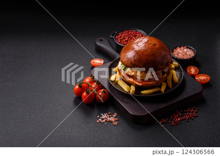 Delicious burger with beef patty, fried egg, bacon, herbs, sauce, salt and spices