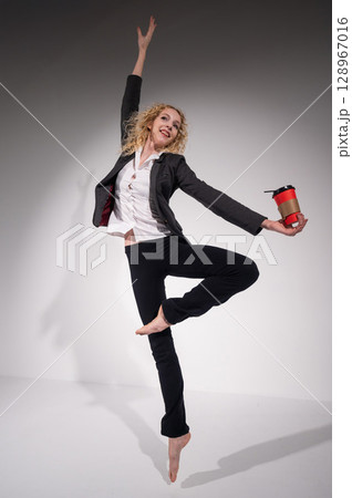 Barefoot ballerina in business suit dancing with a cup of coffee on a white background.