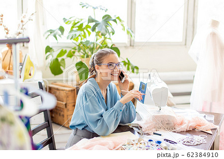 Beautiful seamstress wearing stylish blouse and eyeglasses talking on the phone