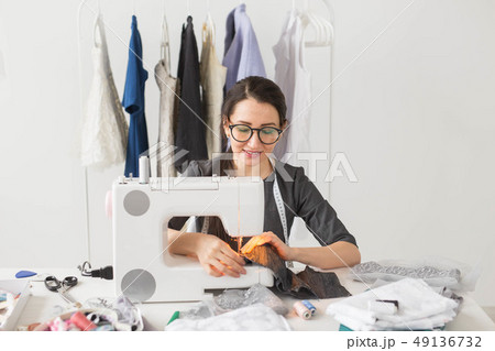 People and fashion concept - Young dressmaker woman sews clothes on sewing machine