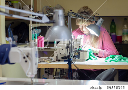 Young beautiful seamstress sews on sewing machine in factory