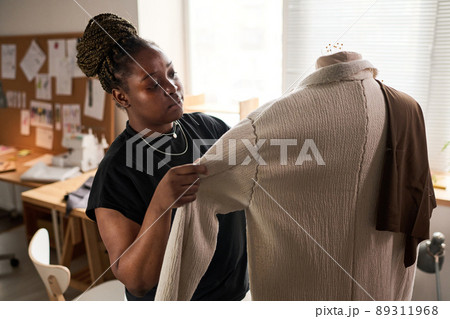 Young black woman looking at beige coat hanging on mannequin while creating new items for seasonal fashion collection in workshop