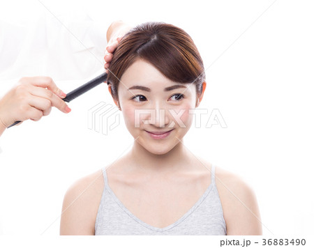 鏡の前で髪の毛を整える若い女性 ヘアケア ビューティー イメージ