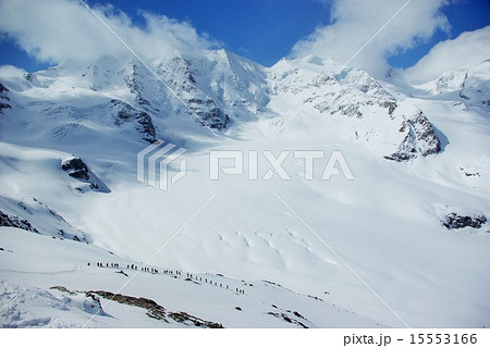 ディアヴォレッツァの雪山と氷河へ降りる人々