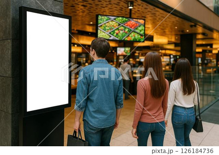 フードコートの入口付近で、デジタルサイネージを見ている人の後ろ姿