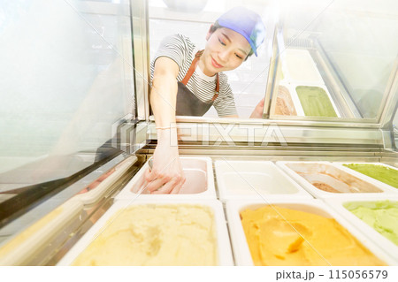 アイスクリームをスクープするジェラート店の女性スタッフ