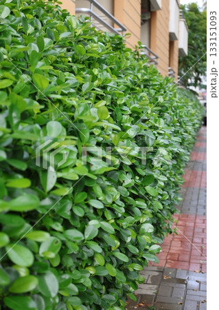 Green leafy plant growing in plastic container near fence. Urban greenery, natural simplicity and outdoor calm.